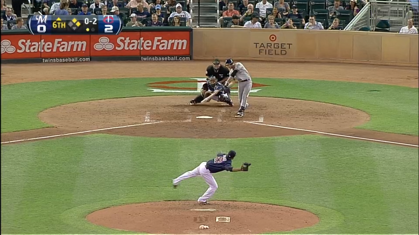 With a 2-0 lead, Liriano started off the sixth inning by walking #9 hitter Edwin Maysonet (rofl), getting Nori Aoki to fly out after a lengthy at-bat, then walking #2 hitter Carlos Gomez (ROFL). Up comes Braun, who had walked and struck out in his prior plate appearances. Liriano starts him off with a slider low and out of the strike zone which Braun goes after and fouls off.